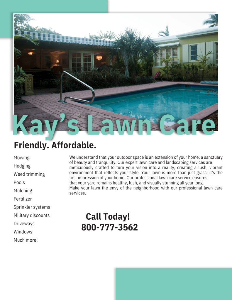 This exercise consisted of learning how to make a concise layout for an ad using InDesign. In this example, we used a fictitious company called “Kay’s Lawn Care.”