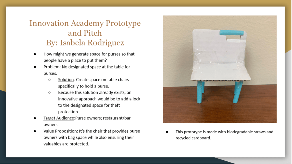 One of my very first individual projects for my minor in Innovation was to create a protype for something that already exists and maximize the innovation to make it more efficient. For this assignment, I decided to pitch a chair that has a clasped closure and lock suited for hanging purses. It would minimize the threat of theft while keeping the purse firmly in place and without sliding off the sides of the chair.