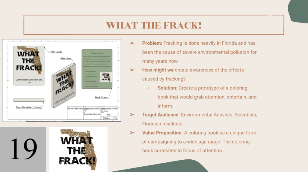 For the class final, we were asked to work in groups and submit a prototype based on the problem statement, “How might we create awareness of the effects caused by fracking?” My group and I choose to create a coloring book designed to bring awareness in a creative and memorable way. Fun fact: I created the prototype for the coloring book using Autodesk Fusion 360.