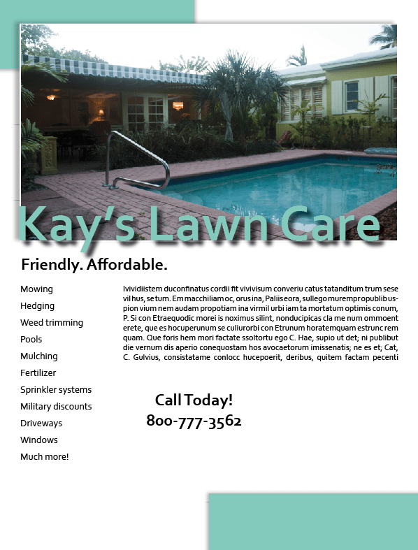 This exercise consisted of learning how to make a concise layout for an ad using InDesign. In this example, we used a fictitious company called “Kay’s Lawn Care.”