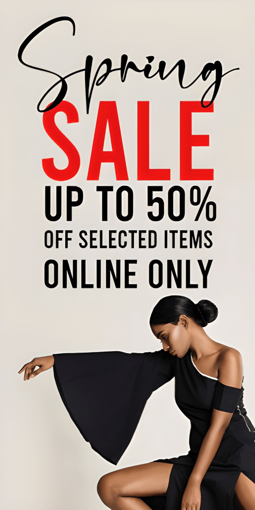 For this assignment, we were instructed to create a banner ad using Photoshop. The ad reads, “Spring Sale. Up to 50% Off Selected Items. Online Only.”
